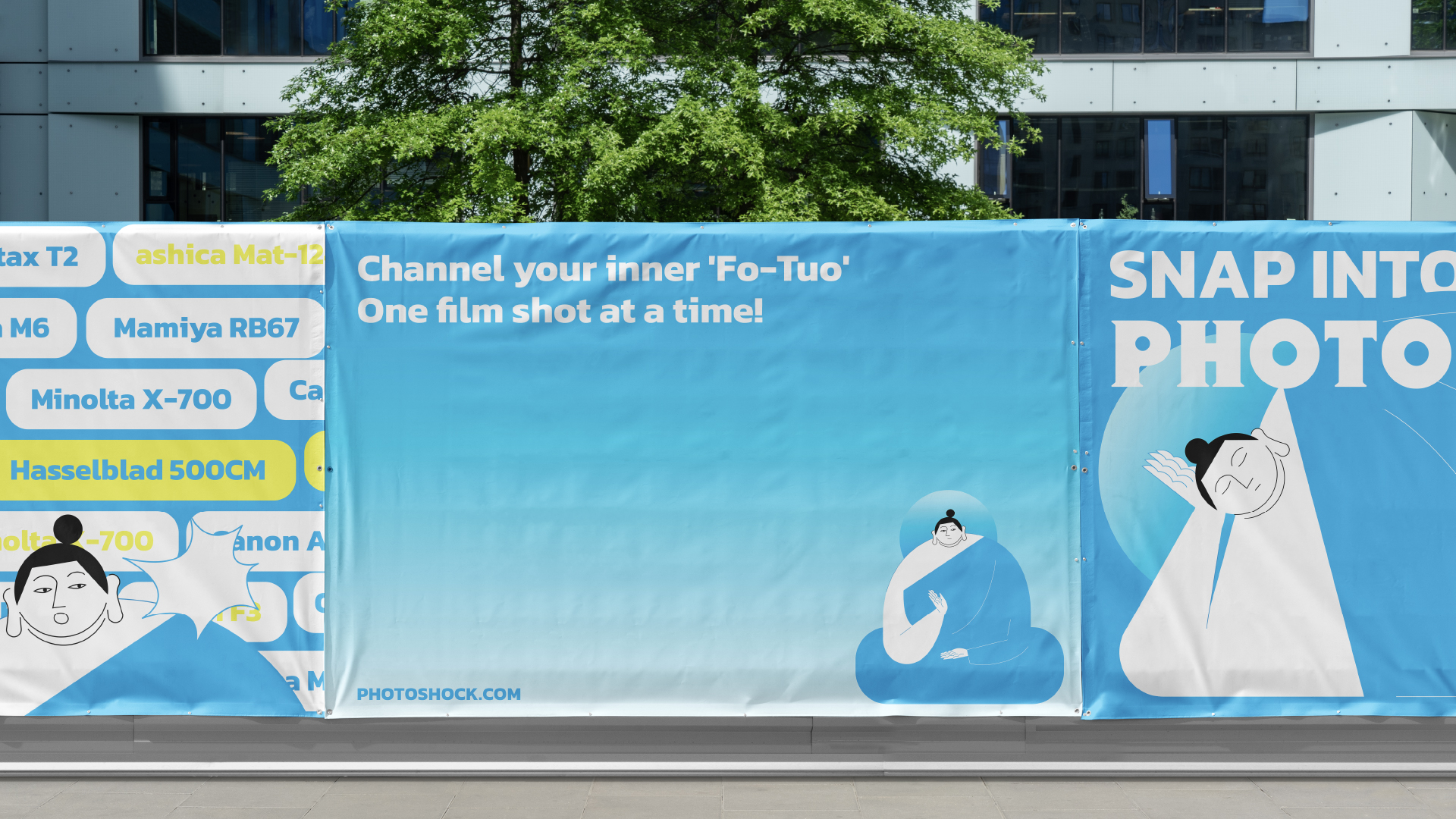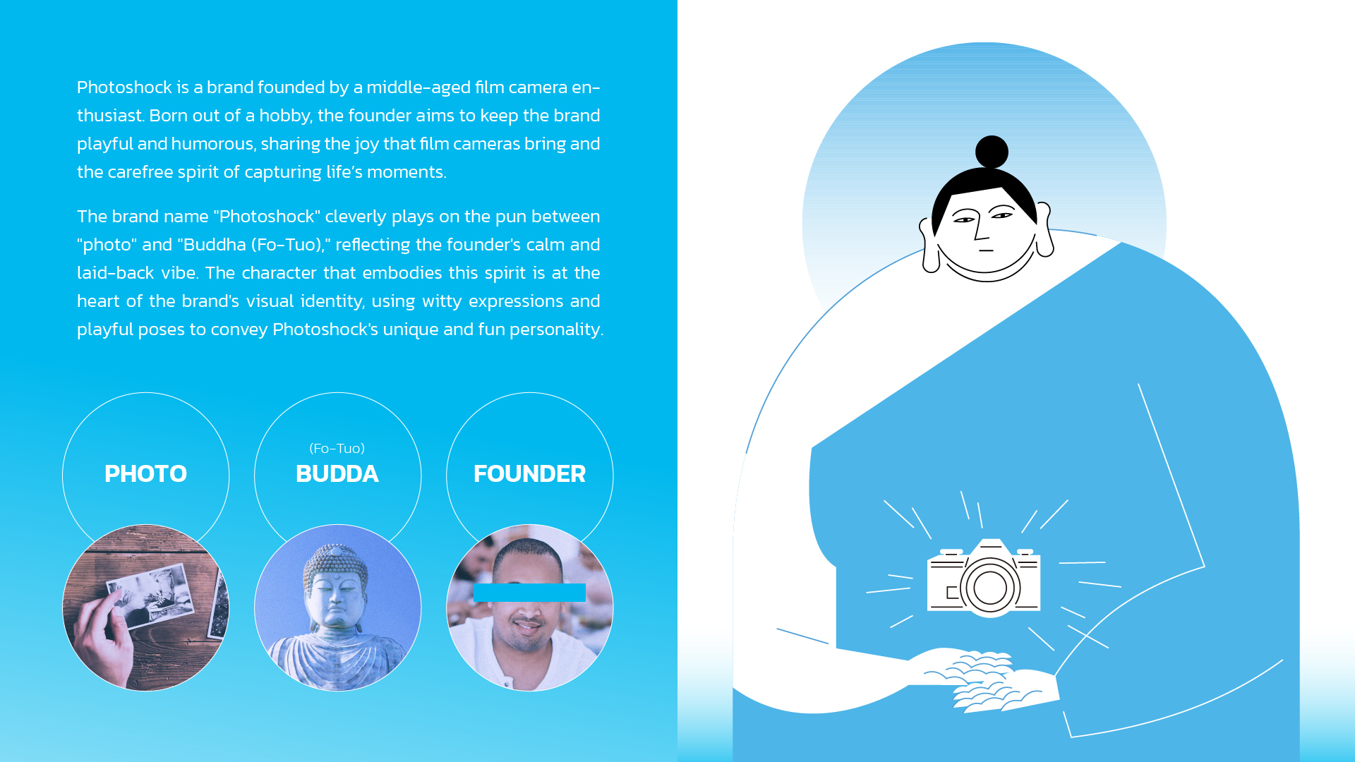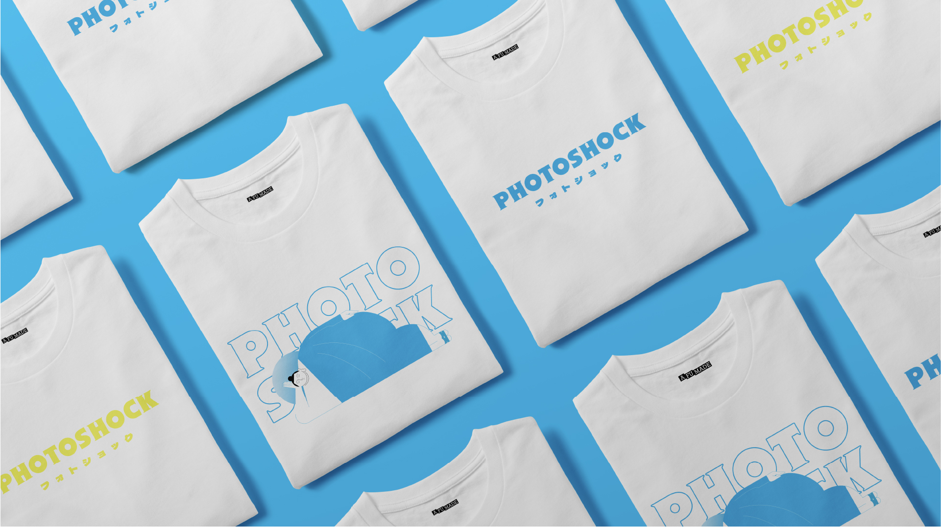 PHOTOSHOCK is a specialty store focusing on antique cameras and related products, expressing a passion for photography through a laid-back and whimsical visual style. The logotype draws inspiration from vintage Japanese teahouse brands from bygone eras, blending seamlessly with contemporary vector illustrations to craft a nostalgic ambiance that aligns with the aesthetic preferences of today's individuals.