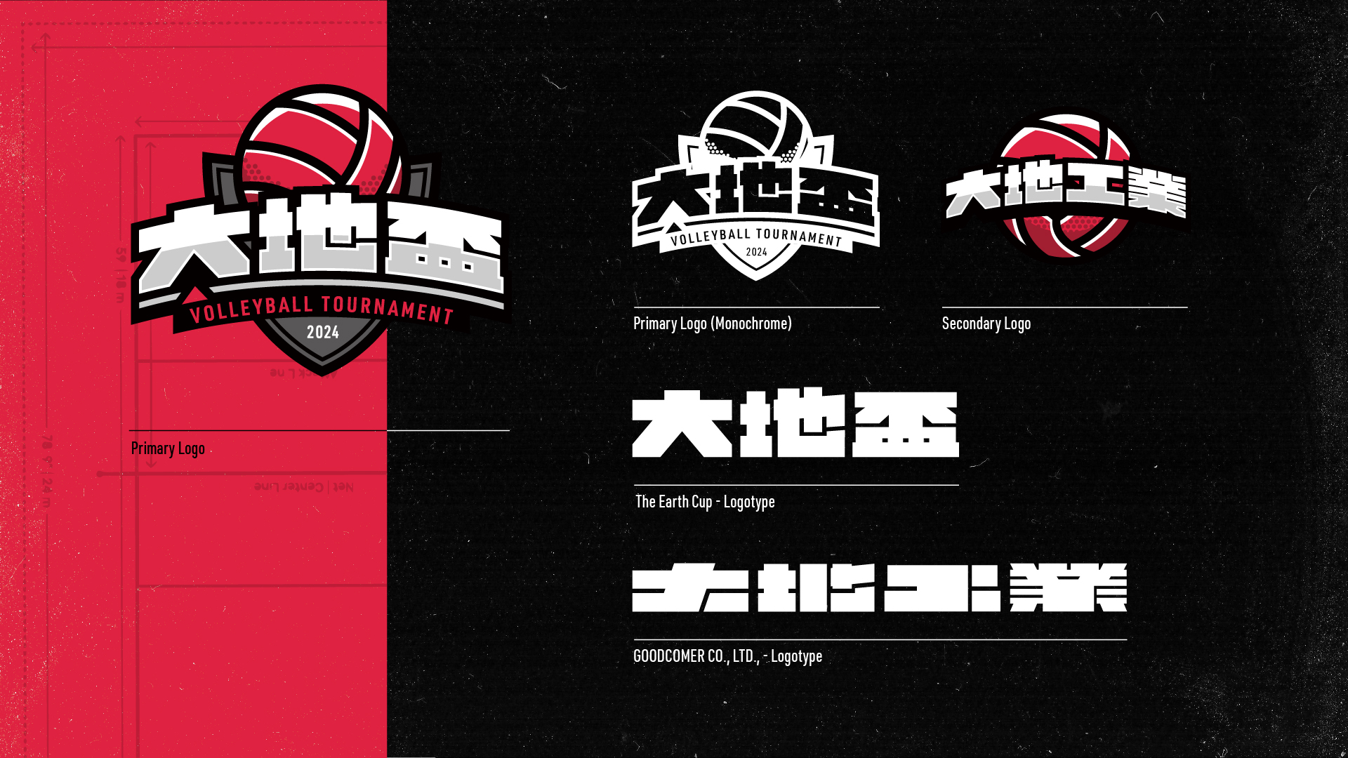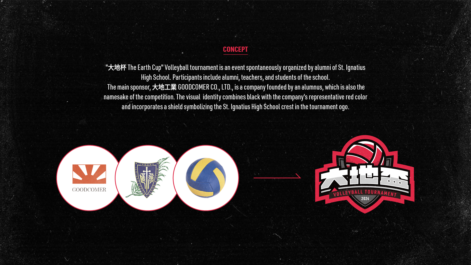 "大地杯 The Earth Cup" Volleyball tournament is an event spontaneously organized by alumni of St. Ignatius High School. Participants include alumni, teachers, and students of the school. The main sponsor, 大地工業 GOODCOMER CO., LTD., is a company founded by an alumnus, which is also the namesake of the competition. The visual identity combines black with the company's representative red color and incorporates a shield symbolizing the St. Ignatius High School crest in the tournament ogo.
